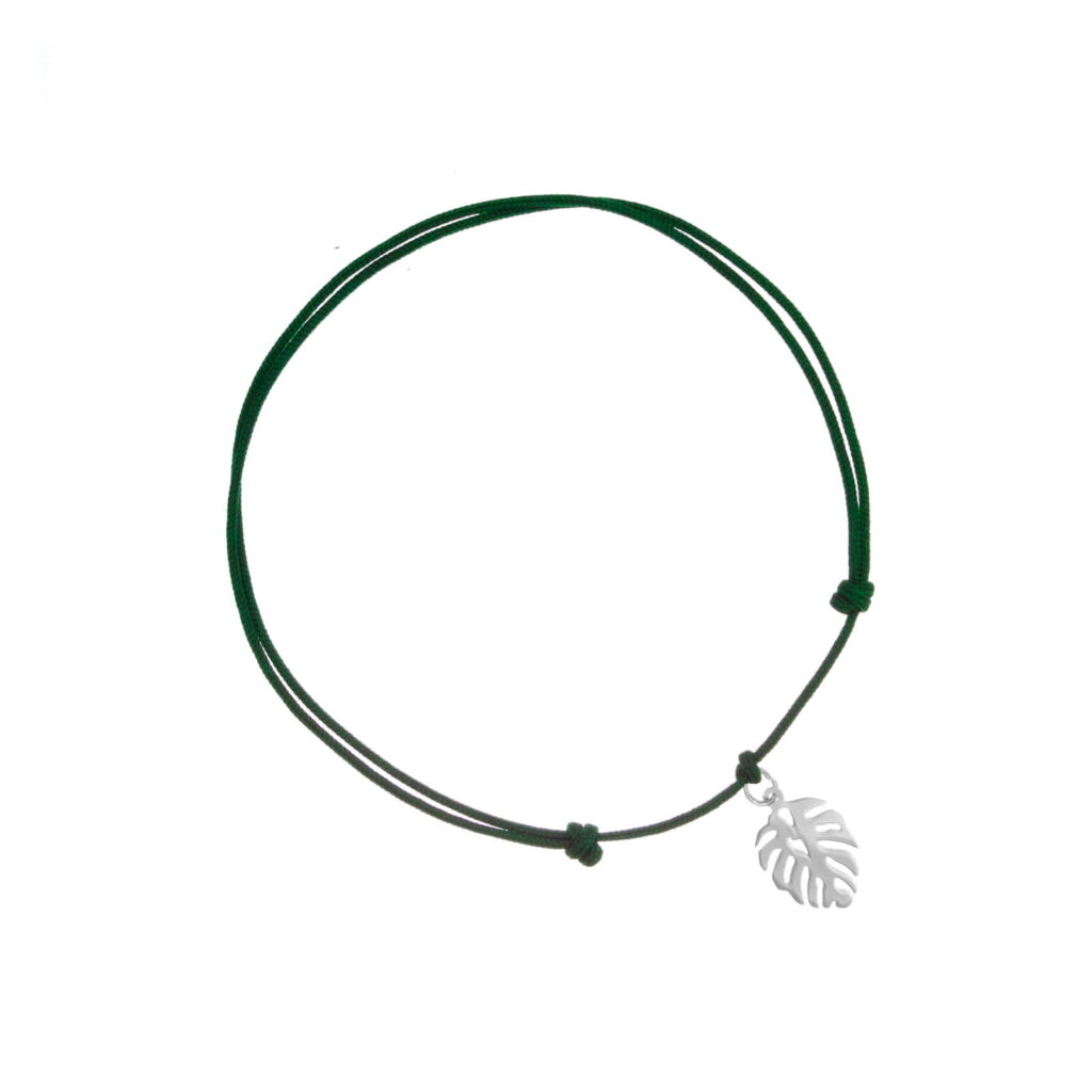 Bransoletka srebrna z liściem monstery na sznurku