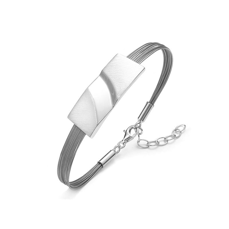 Bransoletka z najwyższej jakości stalowych linek z dekoracyjnym srebrnym elementem to interesująca propozycja dla oryginalnych kobiet.