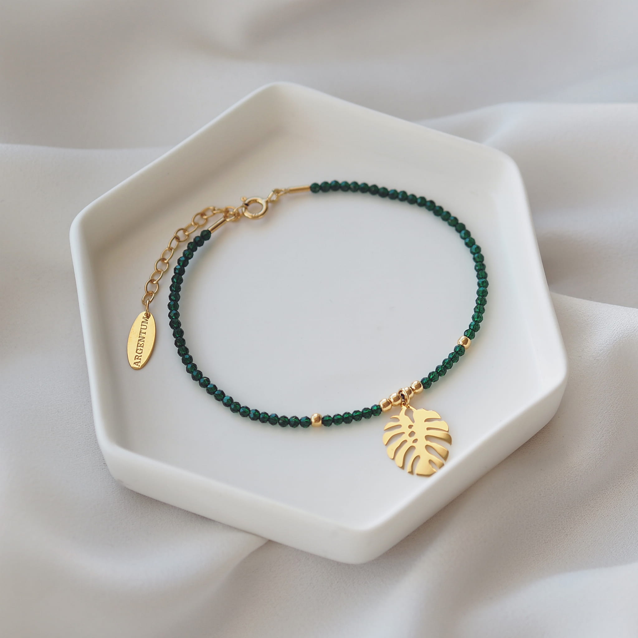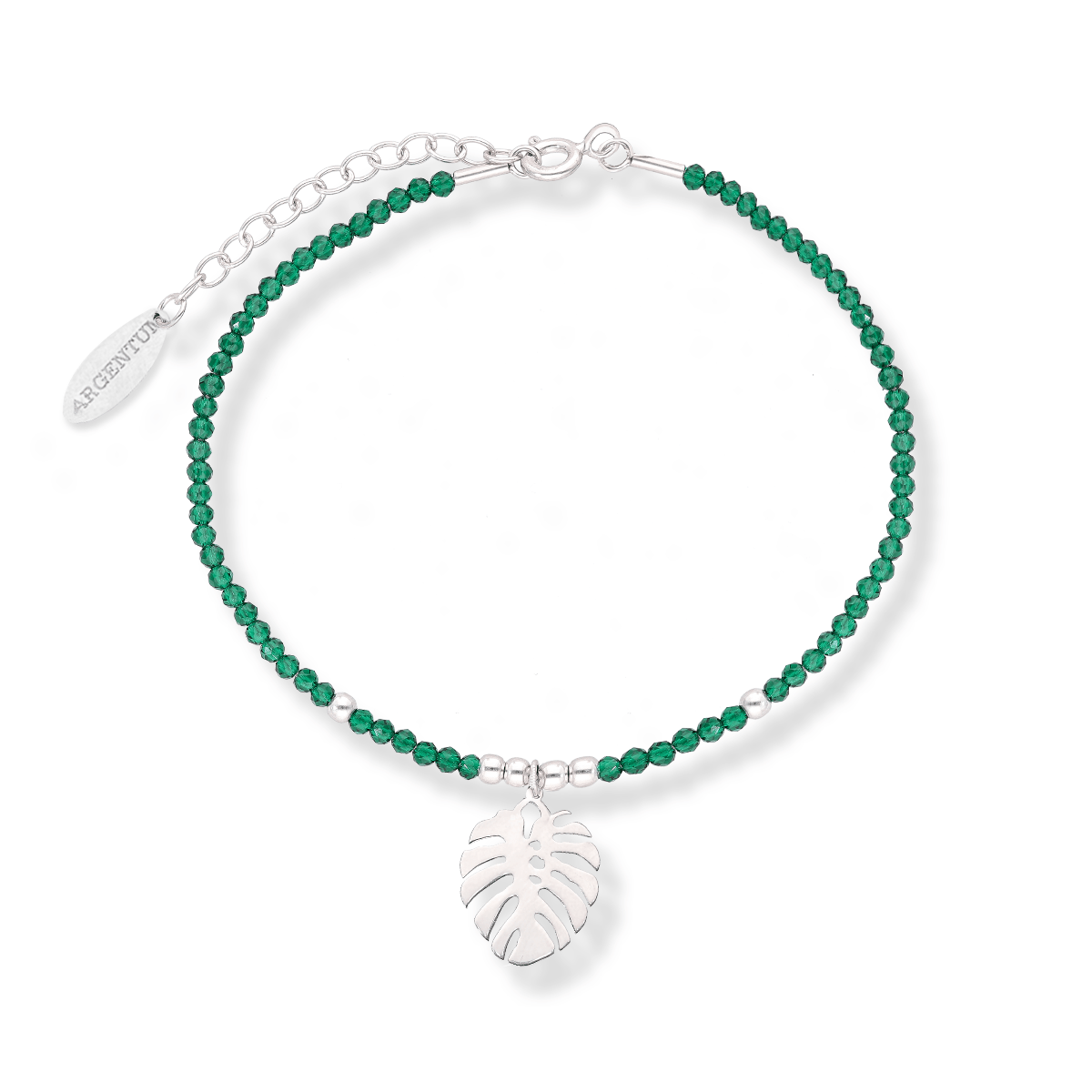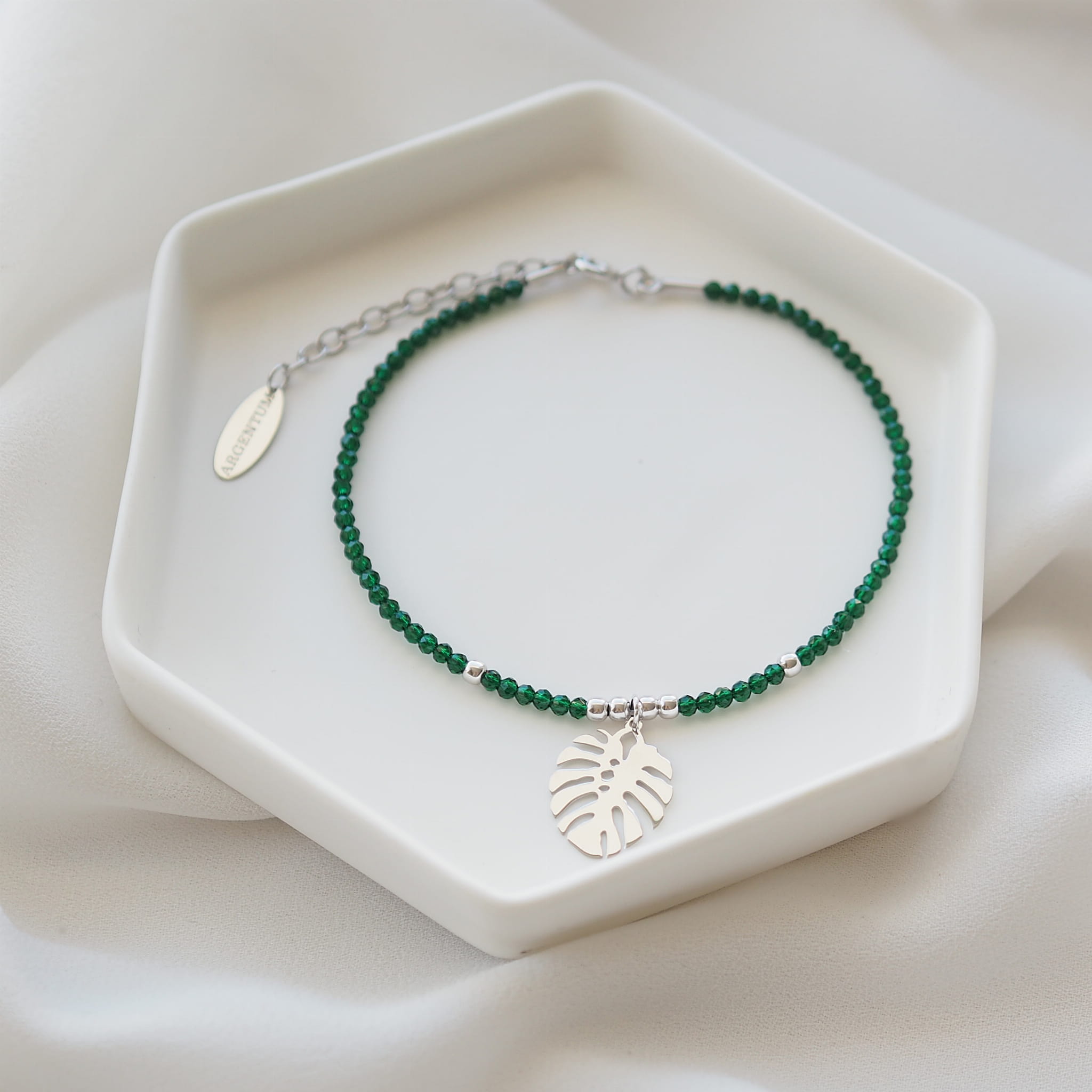Wyjątkowa pod każdym względem, nowoczesna bransoletka wykonana z rodowanego srebra z zawieszką w kształcie liścia monstery oraz zielonymi spinelami to zachwycająca stylistyką propozycja dla wymagających kobiet.
