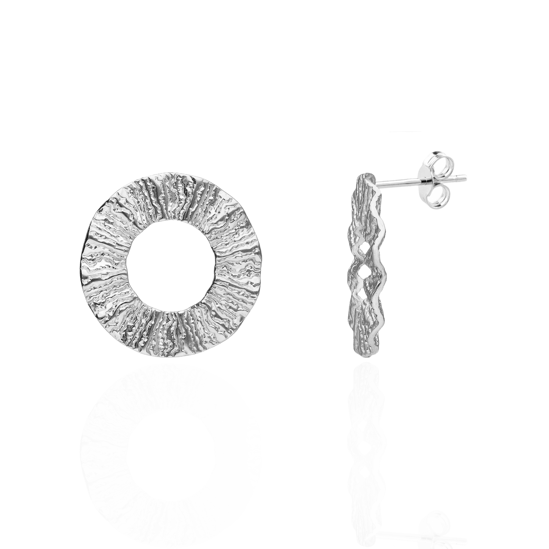 Przyciągające spojrzenia okrągłe kolczyki o karbowanej strukturze wykonane ze srebra pokryte rodem to ukłon w stronę pasjonatek współczesnego piękna.