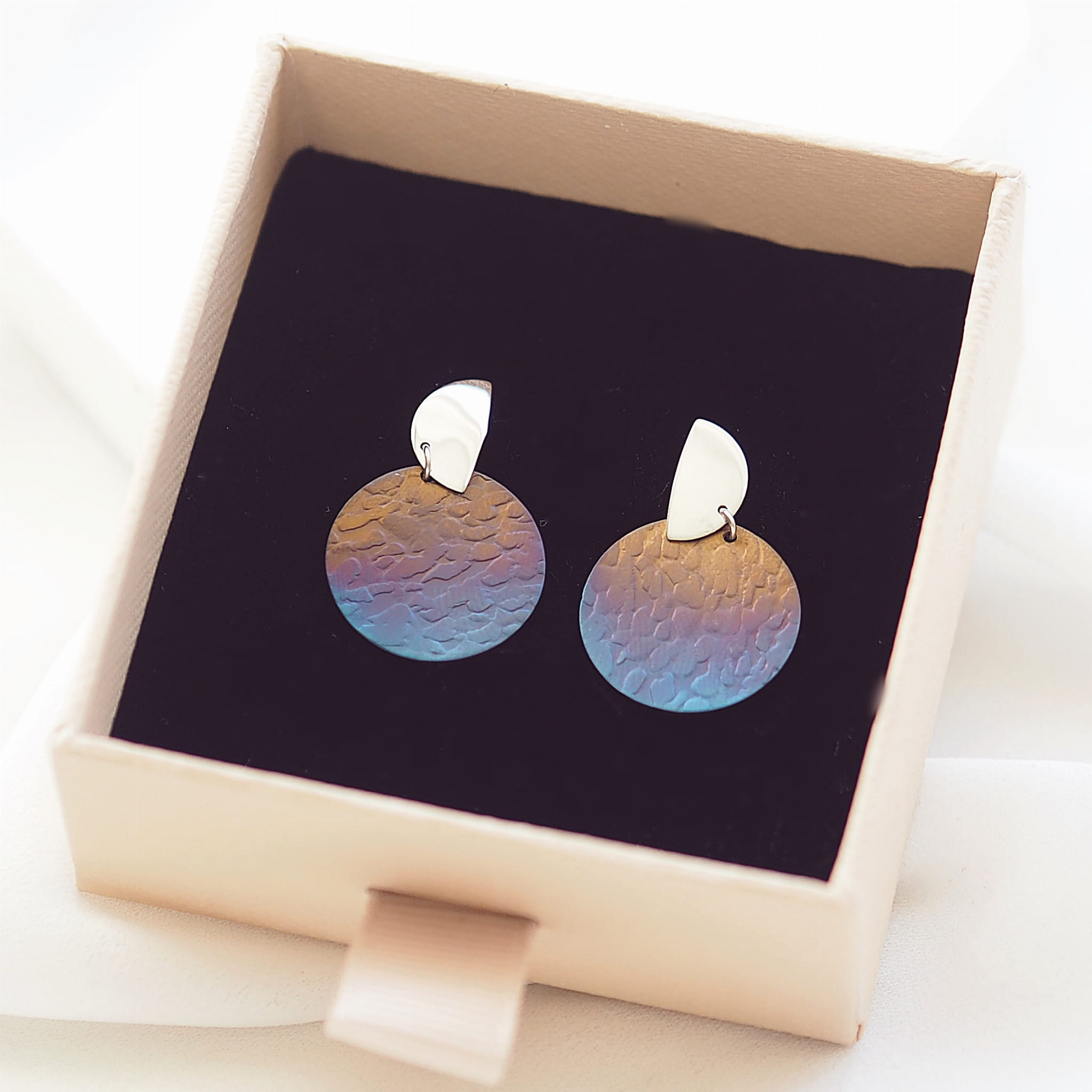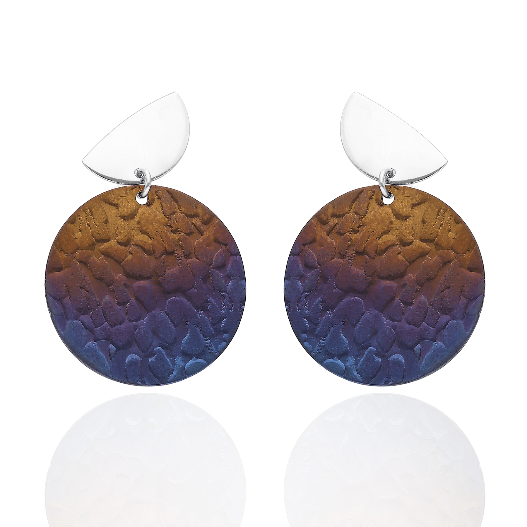 Zaskakujące niebanalną formą, atrakcyjne kolczyki wykonane z rodowanego srebra wraz z oryginalnymi, ręcznie wybarwianymi Tytanami to ukłon w stronę miłośniczek współczesnego designu.