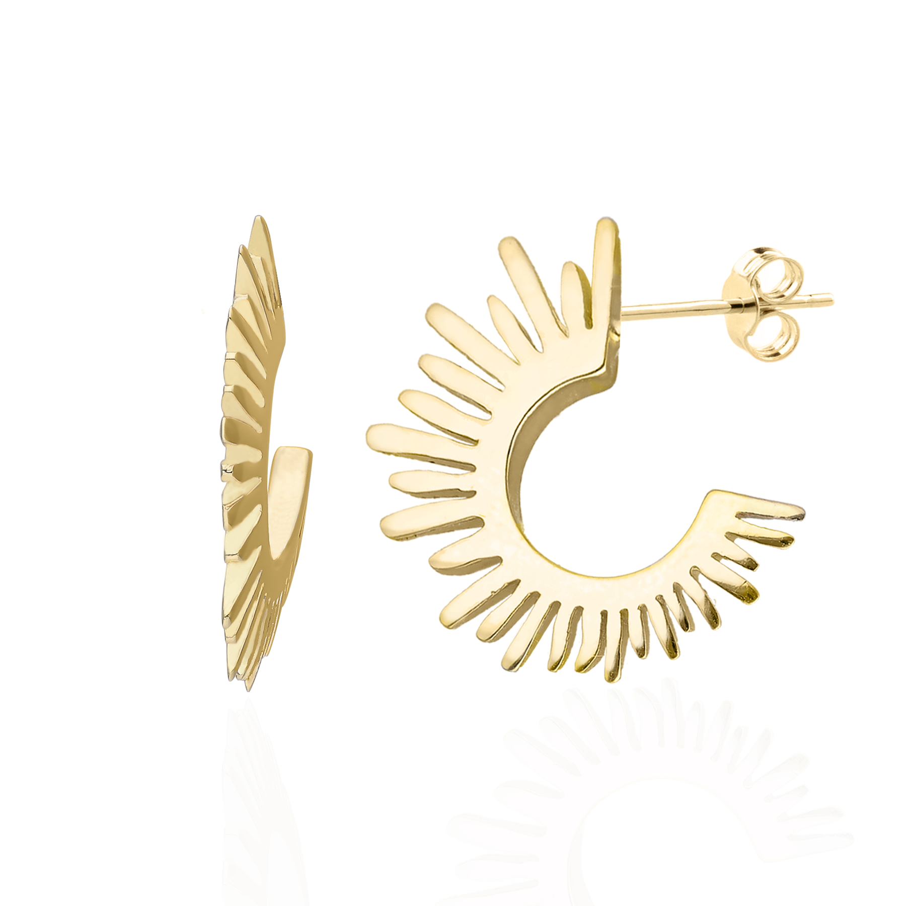 Przyciągające spojrzenia okrągłe kolczyki o polerowane w formie Słońca wykonane ze srebra pokryte rodem to ukłon w stronę pasjonatek współczesnego piękna.
