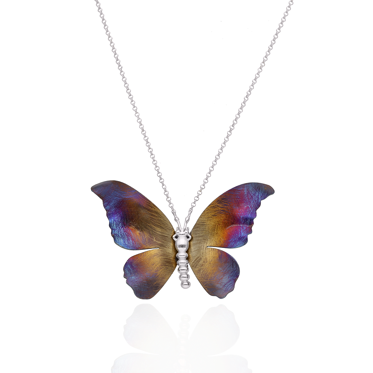 Wyróżniający się na tle innych, oryginalny naszyjnik wykonany z rodowanego srebra wraz wyrazistym wisiorem w kształcie Motyla z tytanu to propozycja dla wszystkich odważnych i przebojowych kobiet.