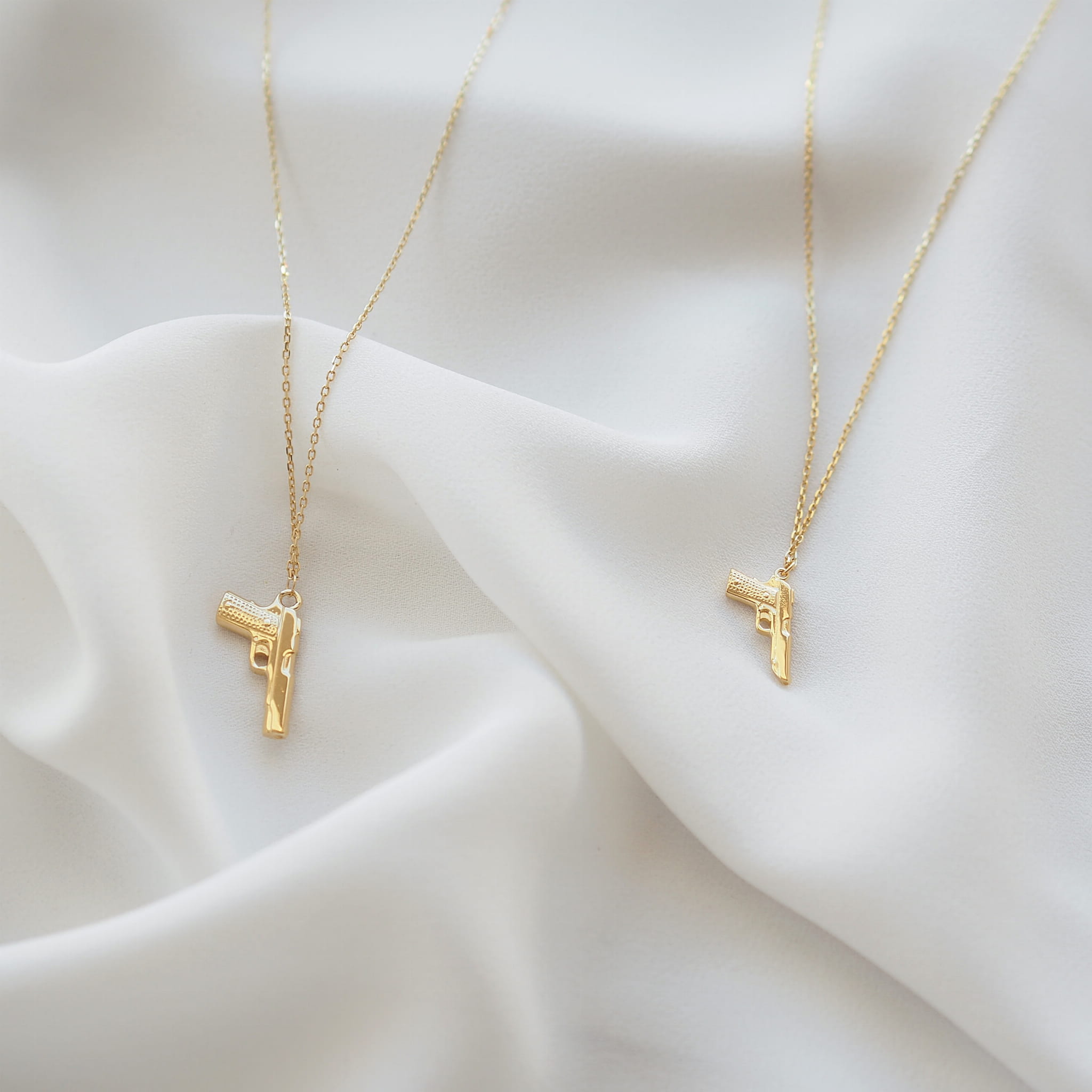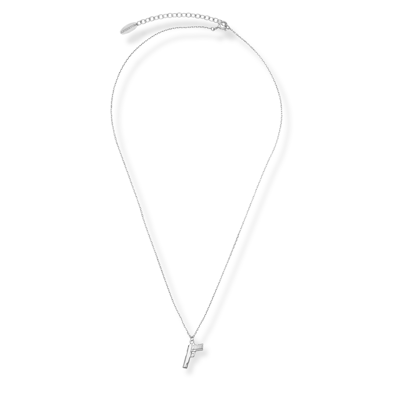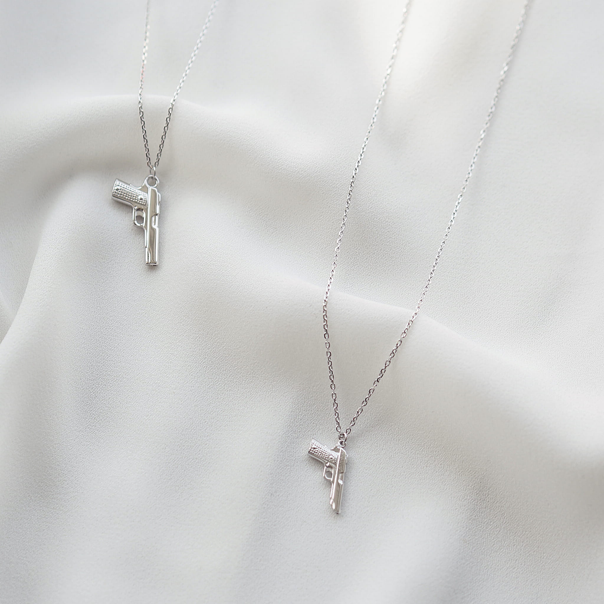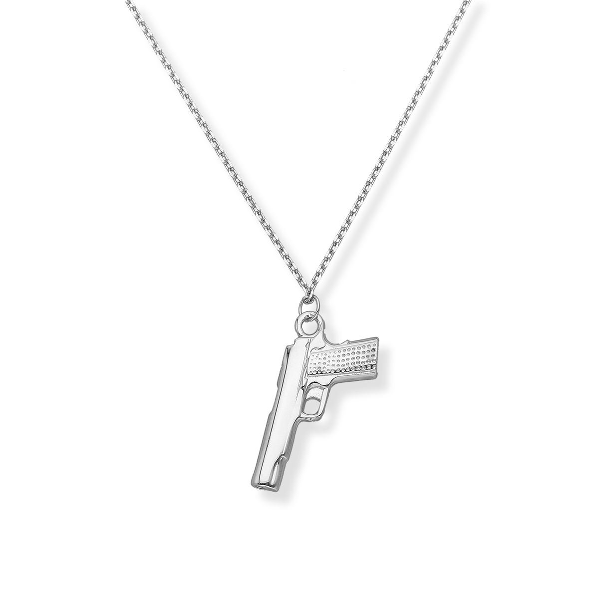 Niezwykle wyjątkowy srebrny naszyjnik rodowany z wisiorkiem w kształcie dużego pistoletu to wspaniała personalizowana propozycja dla wyróżniających się kobiet.