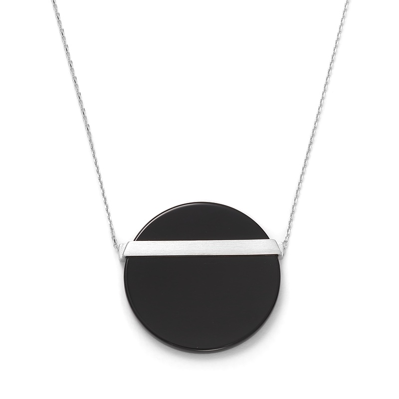 Przyciągający spojrzenia, efektowny srebrny naszyjnik z niezwykle wyrazistym wisiorkiem w kształcie okrągłego onyksu w srebrnej ramie to wyznacznik niebanalnego stylu jakim wyróżnia się współczesny design.