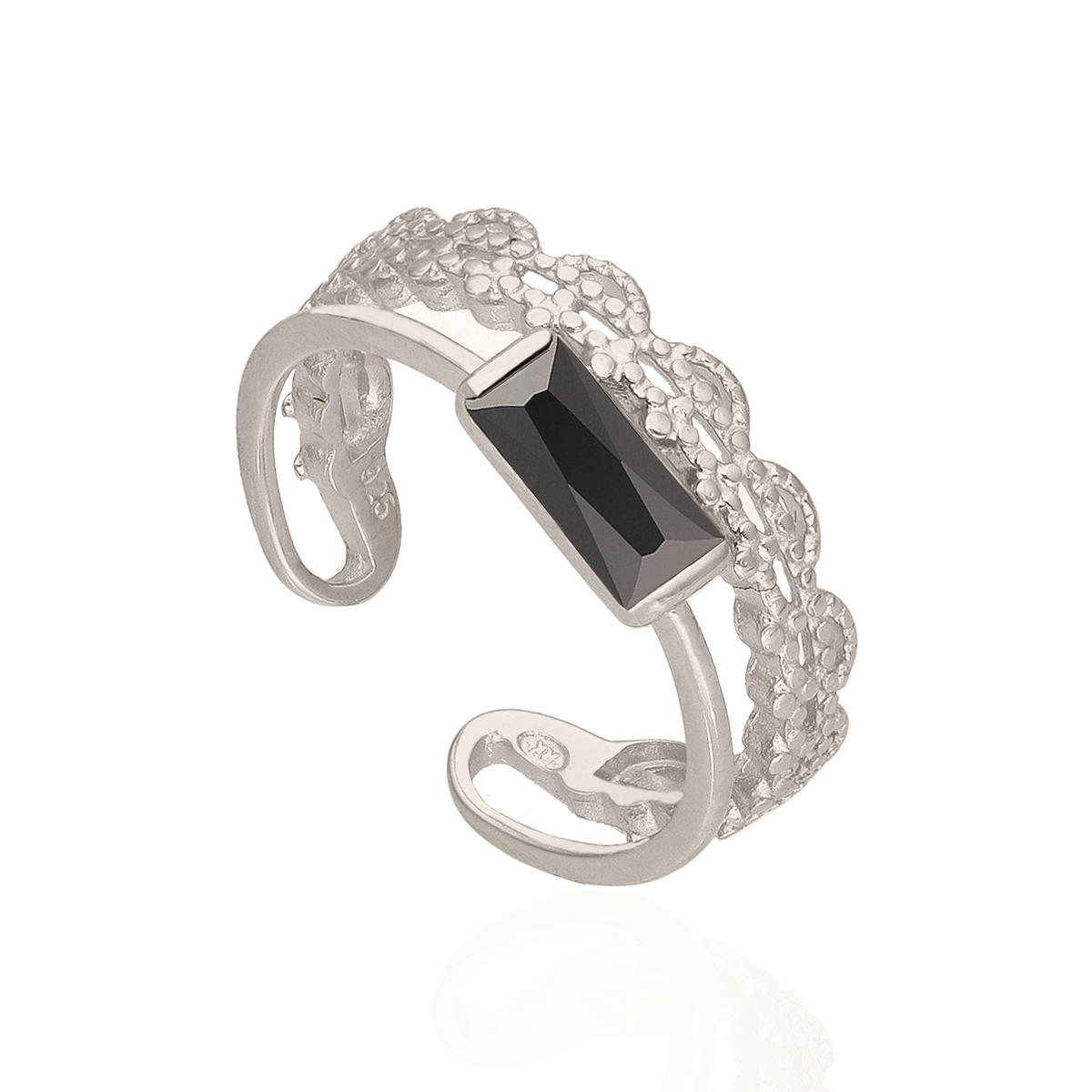 Elegancki, nowoczesny pierścionek srebrny, rodowany z mieniącą się czarną cyrkonią oraz elementem koronkowym to obowiązkowa pozycja każdej modnej kobiecej szkatułki.